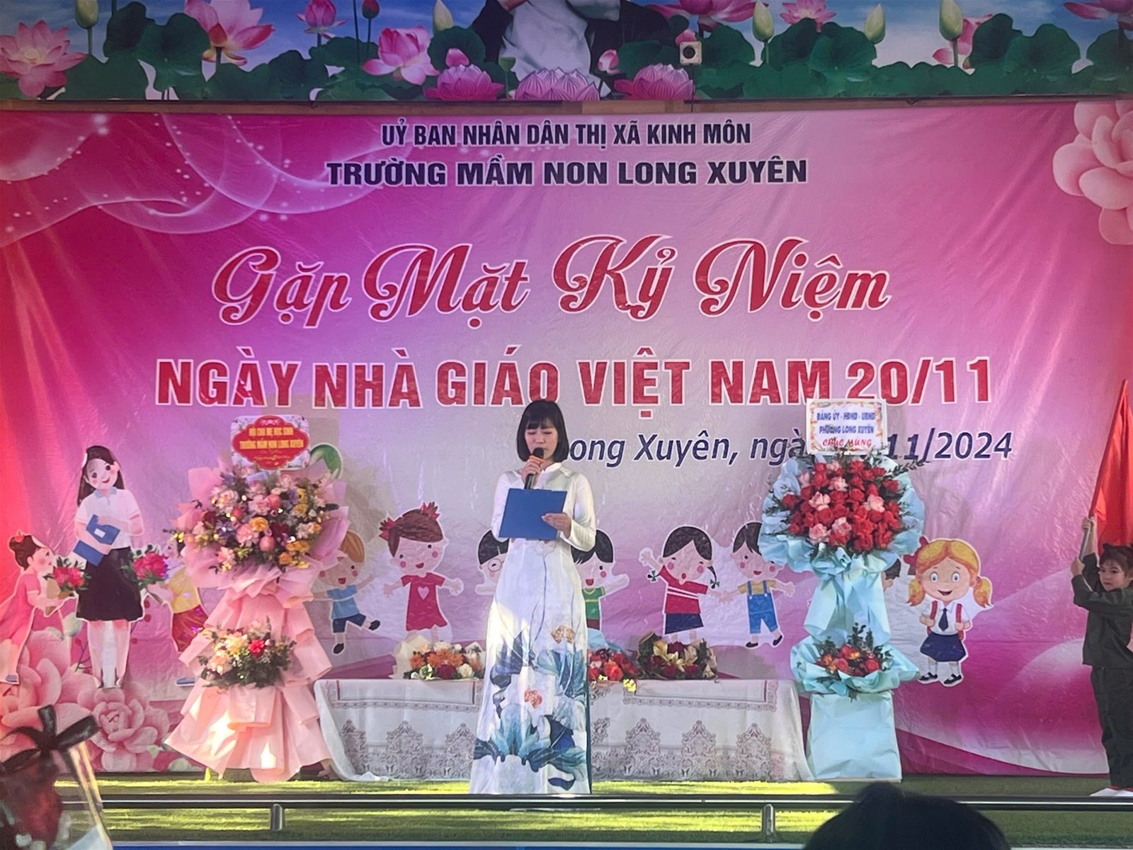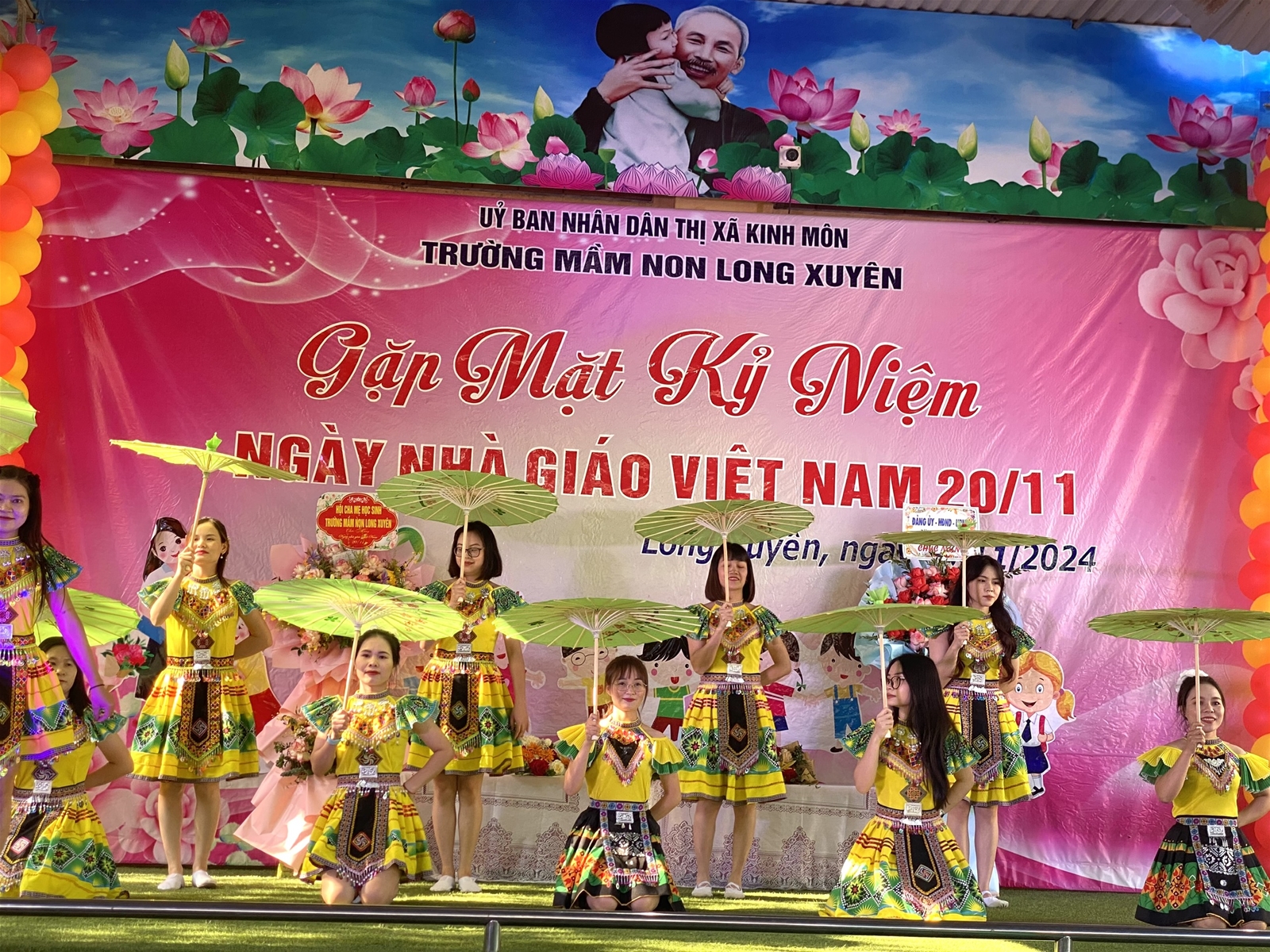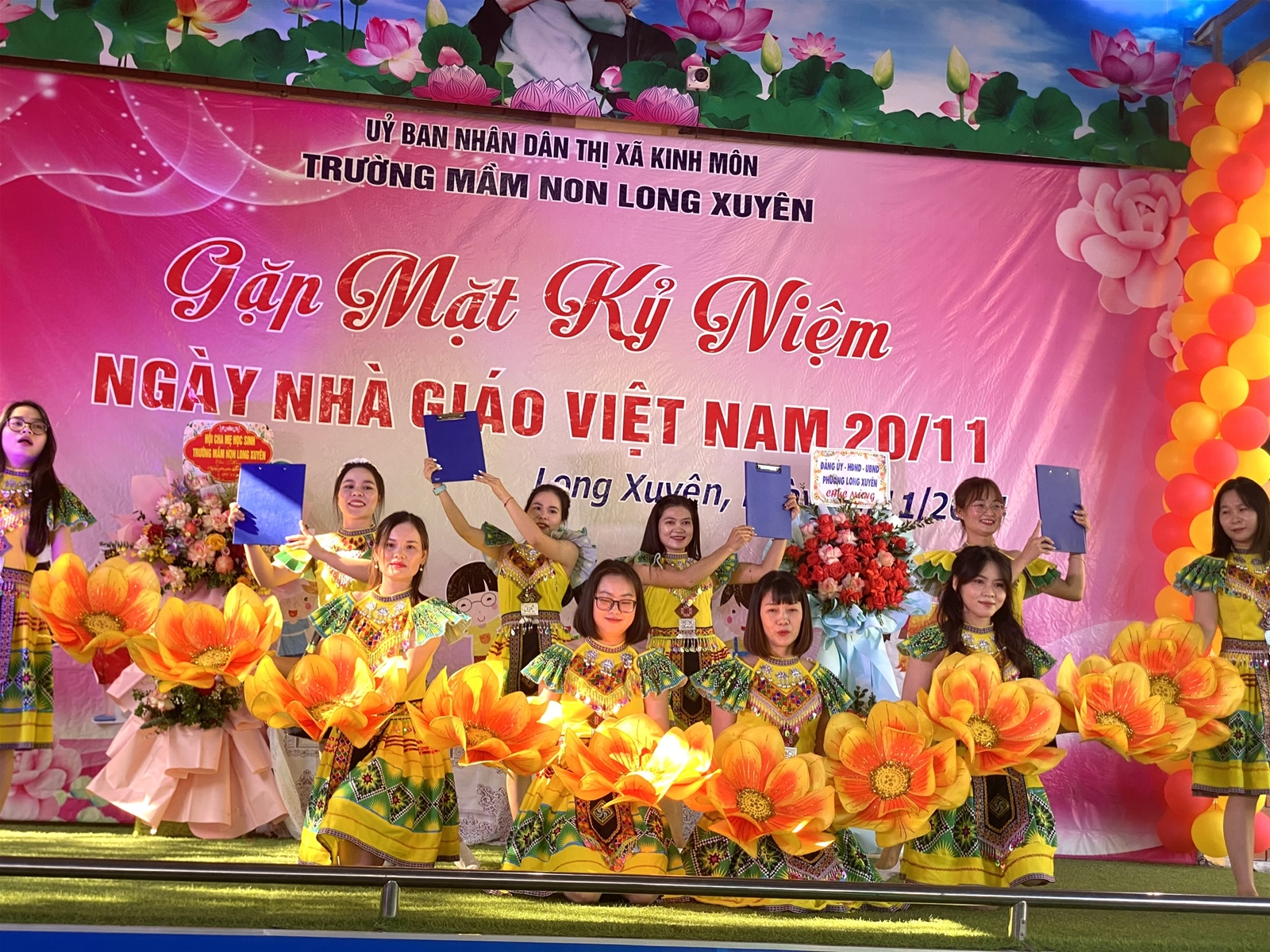 Buổi gặp mặt kỷ niệm kết thúc với các tiết mục văn nghệ, các tiết mục biểu diễn thời trang cùng những đoá hoa tươi thắm dành tặng các giáo viên thay lời chúc sức khoẻ, lời tri ân của các Quý phụ huynh gửi tặng đến tập thể cán bộ giáo viên, CBCNV của Trường Mầm Non Long Xuyên.